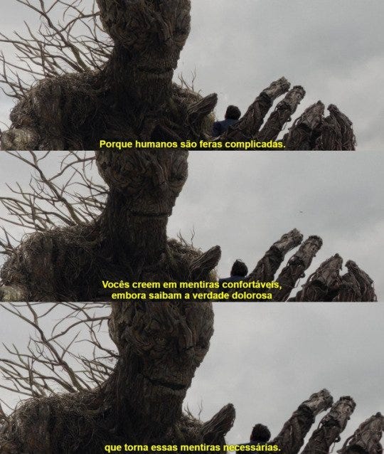 Seres humanos são complexos, e o ato de mentir - pros outros e para si mesmo - é tão complexo quanto. A mentira às vezes é tentativa de aconchego, muitas vezes é um tiro no pé. Pode funcionar como uma arma contra outra pessoa, ou como escudo, na tentativa de ocultar uma verdade que machucaria muito mais. Ninguém admite que gosta da mentira, e pensamos não gostar mesmo. Ainda assim, não vivemos sem ela. Mas então, entre quem conta mentira ou verdade, quem é o mocinho? Nem sempre há mocinho. E também nem sempre há um vilão. A maioria das pessoas está em algum lugar no meio.
